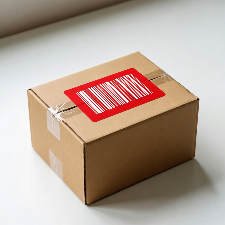 Cardboard box with red barcode label