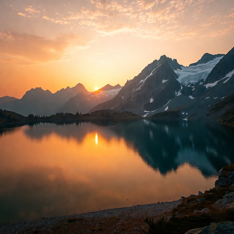 alpine lake, calm water, dawn, dramatic landscape, dusk, glacier, golden hour, hazy sky, high mountains, jagged peaks, mountain lake, mountain range, natural beauty, nature, orange sky, outdoors, peaks, reflection, rocky shore, scenery, serene lake, snowy mountains, sunlight, sunset, water reflection, wilderness, sunrise