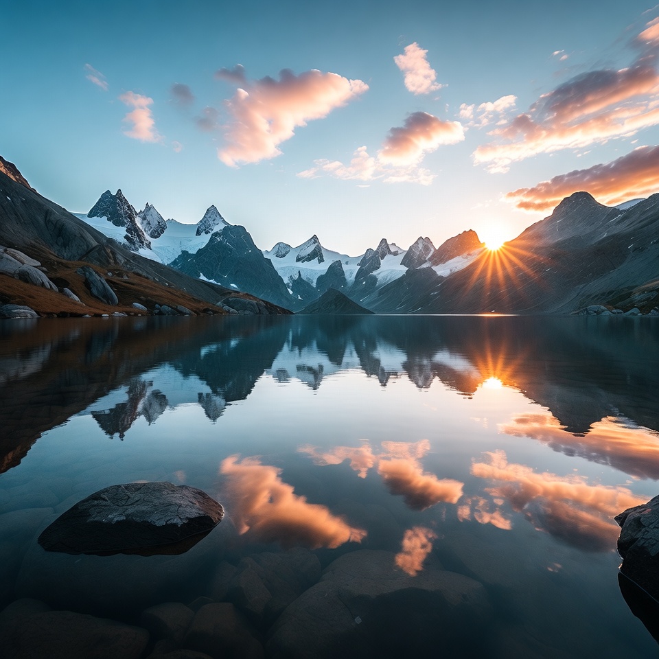 Snow-capped mountains rise dramatically around a calm lake reflecting their peaks and the vibrant sunset sky. Clouds in shades of blue, pink, and orange glow above the rugged terrain. Sun rays burst through the peaks, mirrored perfectly in the glassy water with foreground rocks.