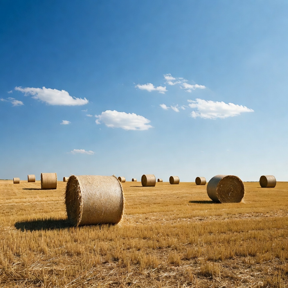 Multiple large round hay bales are scattered across a dry golden stubble field under a clear blue sky with scattered white clouds. The bales are tightly wrapped in straw and cast long shadows in the sunlight. The expansive rural landscape emphasizes the vastness of the countryside.