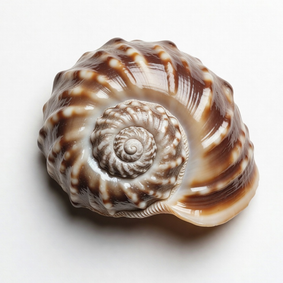 A detailed seashell with brown and white striped patterns lies on a white background. The spiral shell features ridged edges and a smooth inner coil. It is viewed from above, showcasing its intricate textures.
