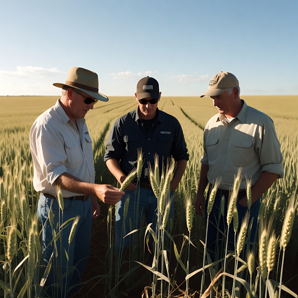 Three middle-aged White men in hats and work shirts stand in a golden wheat field under a clear sky. One farmer holds a wheat stalk while they all inspect the crops closely. They wear casual farming attire including khaki pants and button-up shirts.
