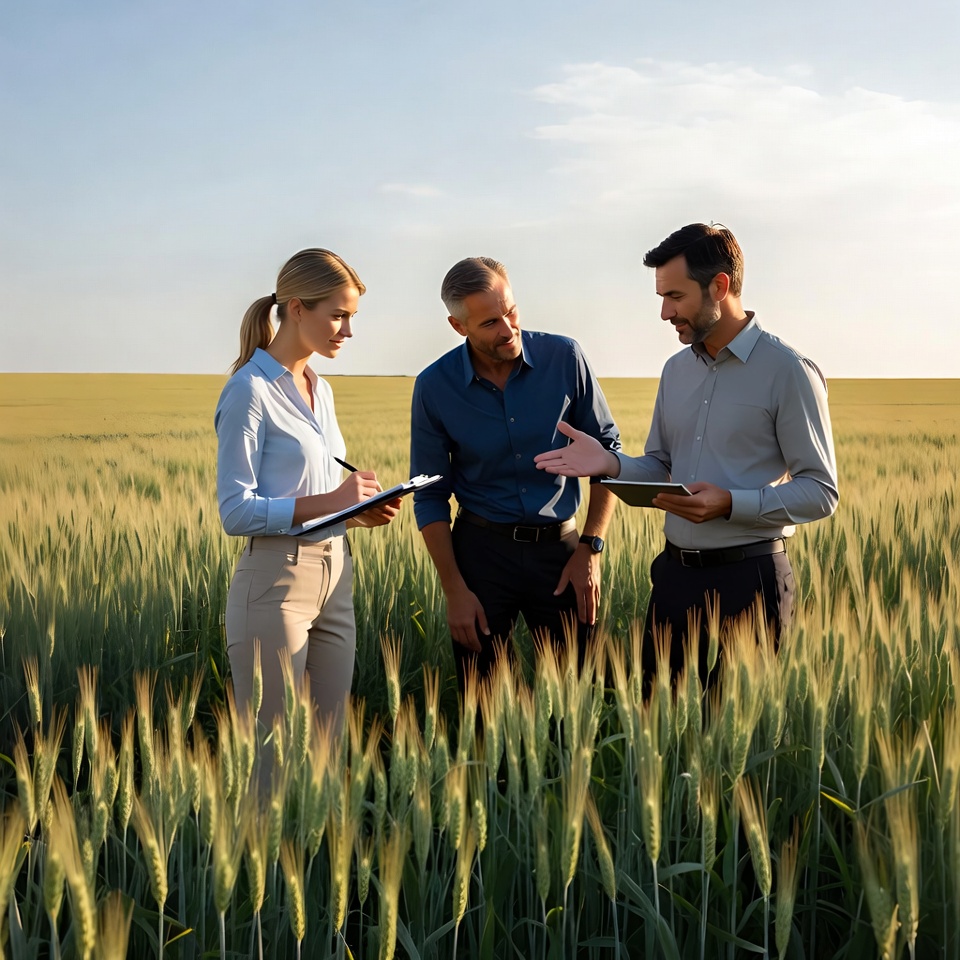 Three business professionals, two men and one woman, stand in a golden wheat field during sunset. The blonde woman in a light blue blouse and beige pants holds a notepad, while the older man in a blue shirt gestures, and the younger man in a gray shirt holds a tablet. They appear engaged in a discussion amid tall wheat stalks under a clear sky.