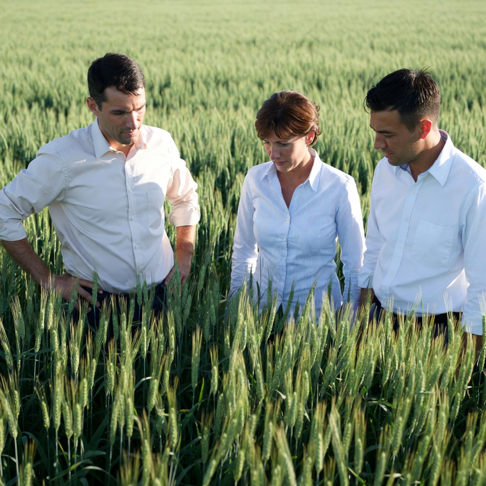 Two men and one woman in white shirts bend down to examine green wheat stalks in a vast field. The group stands closely together amid the tall crops under natural light. They appear focused on the plants in their agricultural setting.