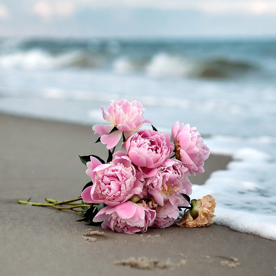beach, beach flowers, bloom, bouquet, cloudy sky, coast, floral, flowers, fresh flowers, nature, ocean waves, oceanfront, peony bouquet, petals, pink flowers, sand, sea, seashore, shoreline, stems, summer, water, pink peonies
