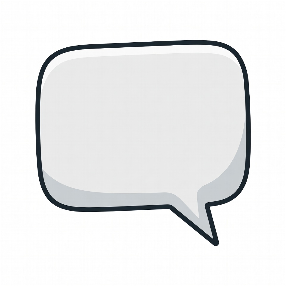 A simple white speech bubble with a curved tail is illustrated with clean black outlines. It features a flat design on a transparent background. The bubble is empty, ready for text.