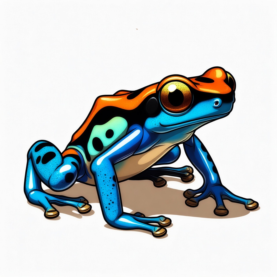 A vibrant poison dart frog with bright blue skin, orange markings, and black spots stands on a white background. Its large golden eyes and glossy texture are prominent. The illustration features detailed toes and a subtle shadow beneath.