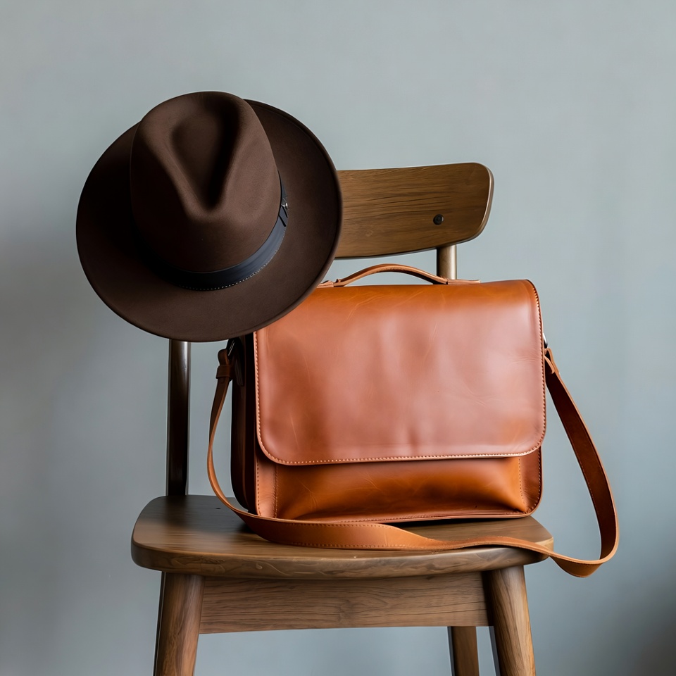 Brown Fedora Hat and Leather Messenger Bag