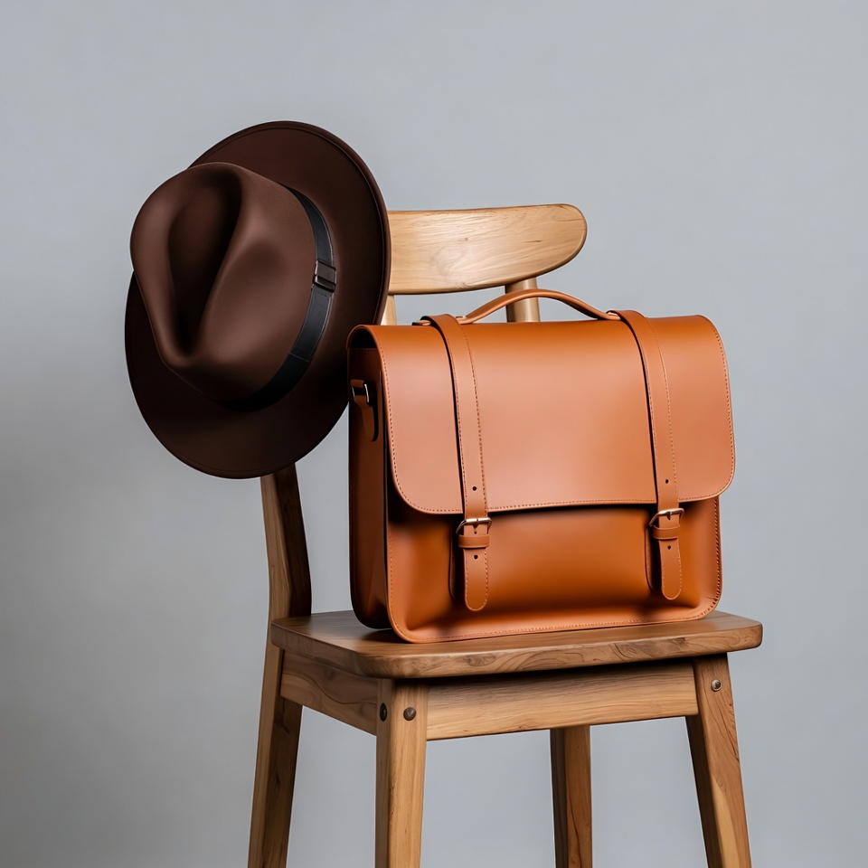 accessories, bag, brown, brown bag, brown hat, chair, fashion, fedora hat, hat, isolated background, leather, leather hat, messenger bag, wood, wooden chair, leather satchel