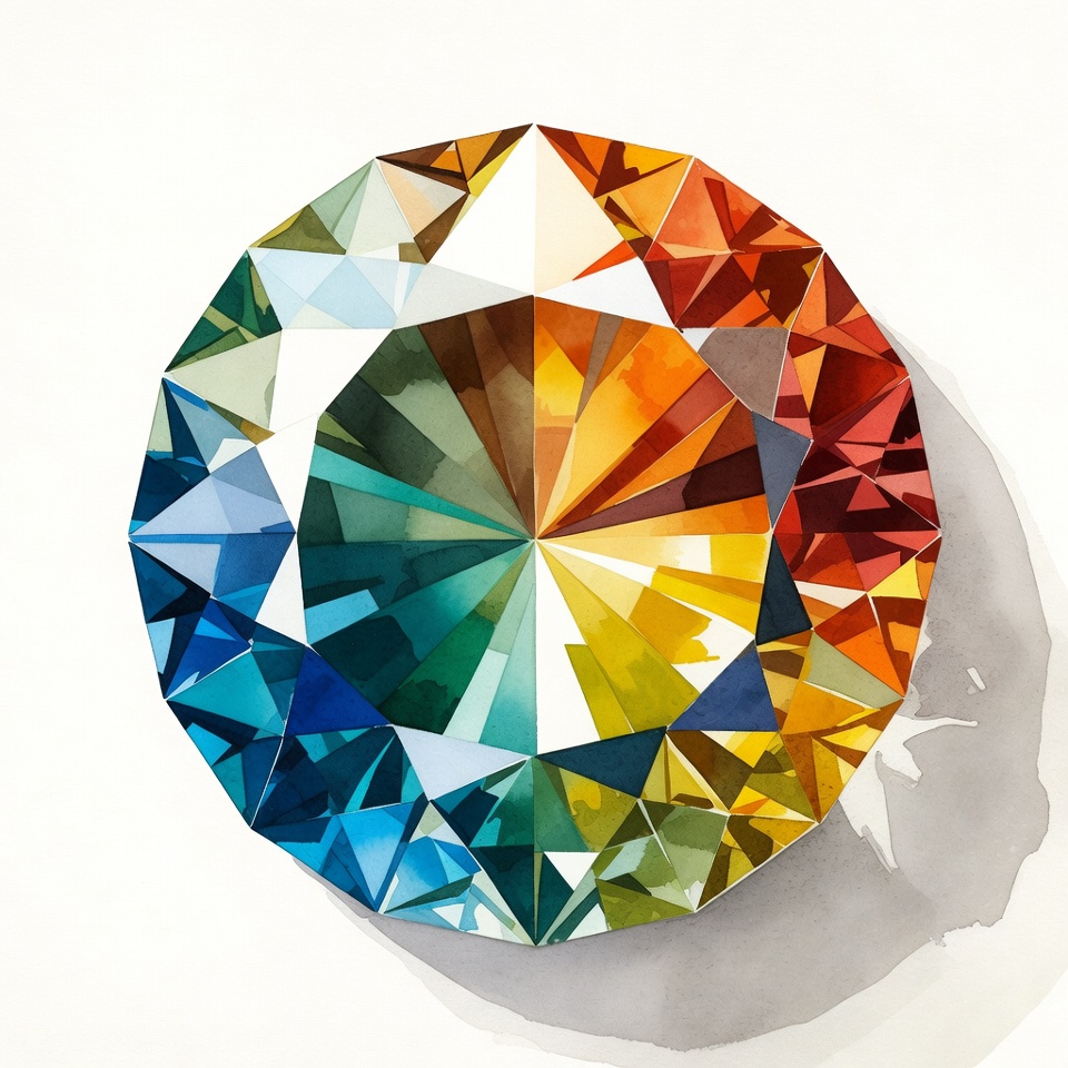 A vibrant diamond-shaped illustration features multifaceted geometric panels in shades of blue, green, yellow, orange, and red. The artwork is rendered in watercolor style with a subtle shadow on a white isolated background. Each triangular facet displays rich color gradients.