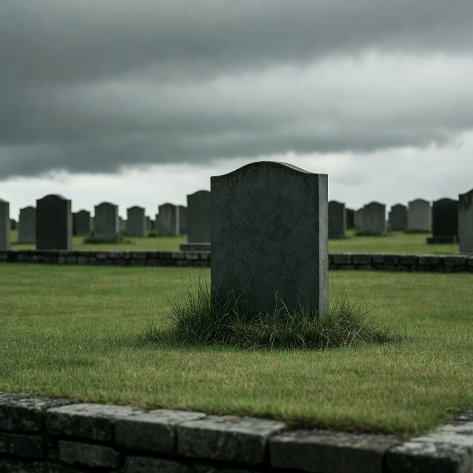 A tall gray gravestone stands prominently in the center of a grassy cemetery under a dark, cloudy sky. Numerous other gravestones are visible in the background, surrounded by green grass and a stone wall border. Tall grass grows around the base of the main gravestone.