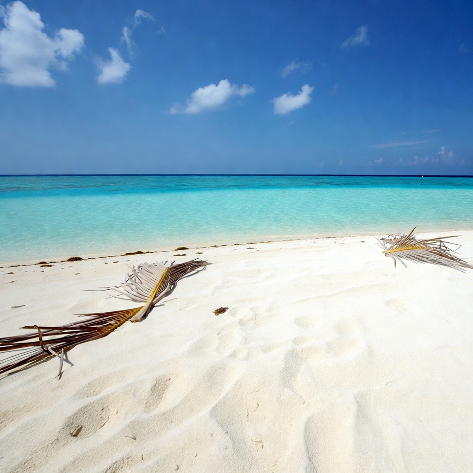 A pristine white sand beach meets turquoise ocean waters under a clear blue sky with scattered white clouds. Several dried palm fronds lie scattered on the sandy shore. The horizon shows calm seas extending to distant islands.