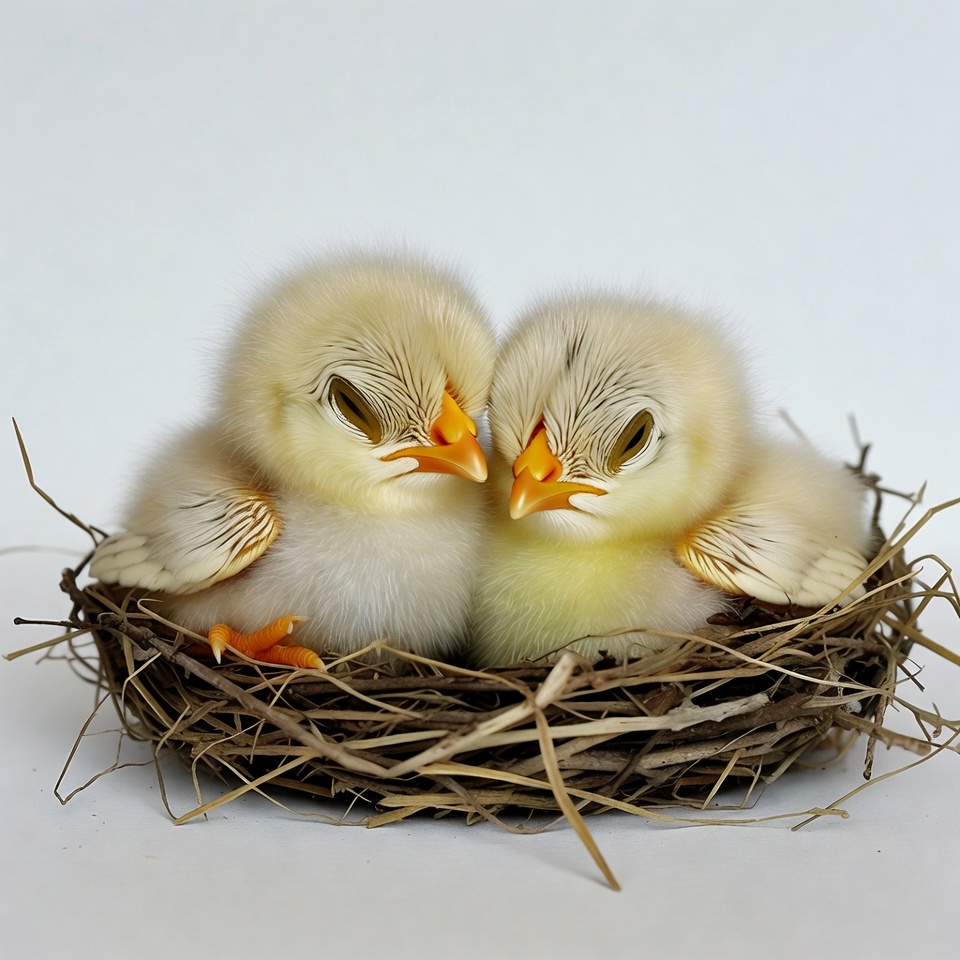 animals, baby chicks, bird nest, chick nest, cute chicks, fluffy chicks, isolated background, nest, newborn chicks, orange beaks, poultry, twigs, two chicks, yellow chicks, chicks