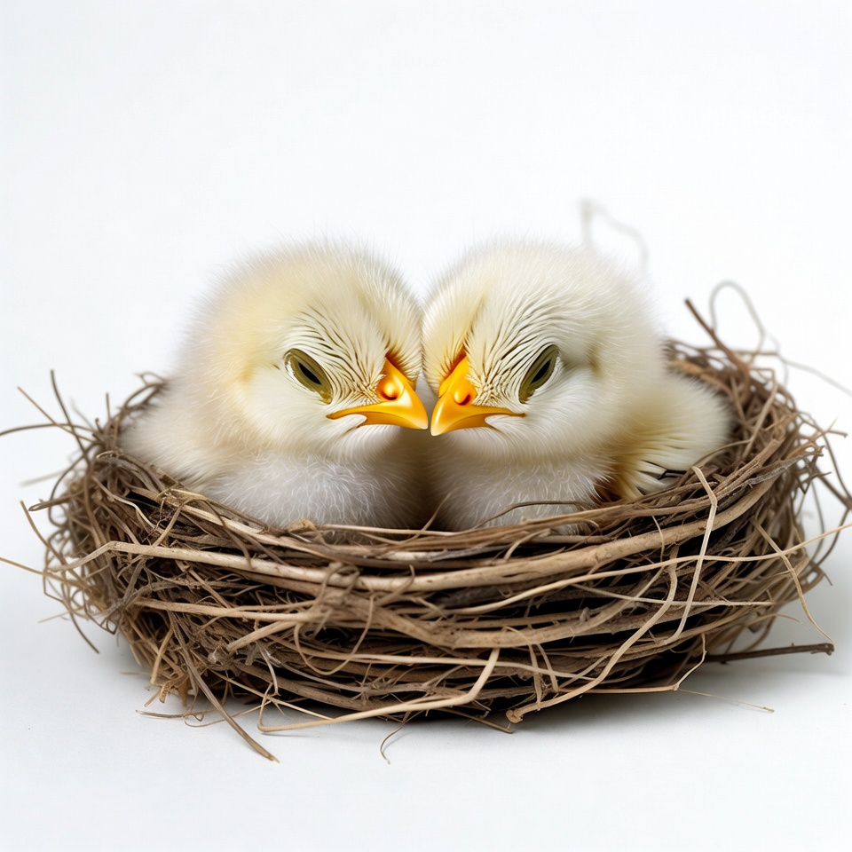 adorable birds, animals, baby chicks, beak, bird nest, chicken chicks, cute chicks, farm animals, feathers, fluffy chicks, green eyes, isolated background, nest, newborn chicks, orange beak, poultry, two chicks, white background, wildlife, yellow chicks, chicks