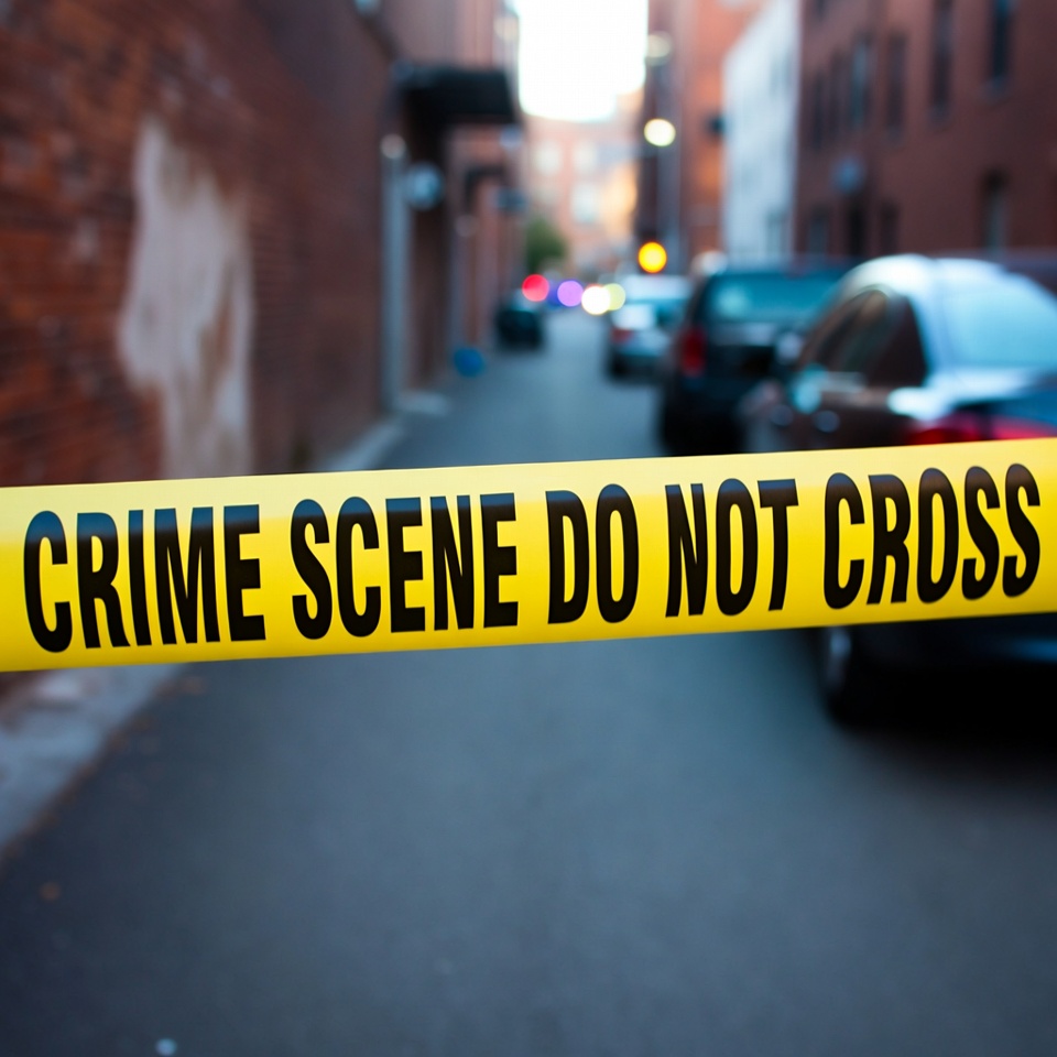 Yellow crime scene do not cross tape stretches across a narrow brick alleyway at night. Blurred police cars with lights are visible in the background near the alley entrance. Brick walls and parked vehicles line the dimly lit street.