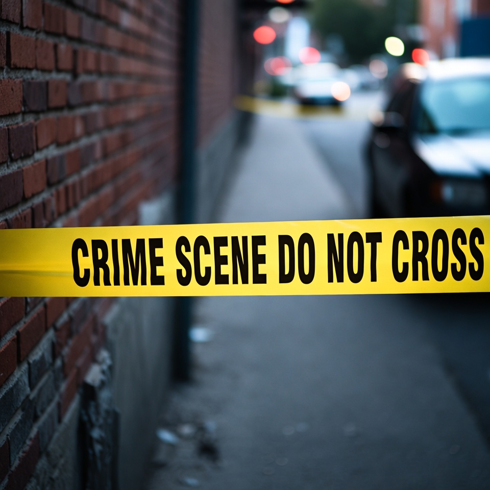 Yellow crime scene tape reading 'CRIME SCENE DO NOT CROSS' stretches across a narrow alley between brick walls. Blurred police cars and streetlights are visible in the background at night. The tape is prominently displayed against the urban brick surface.