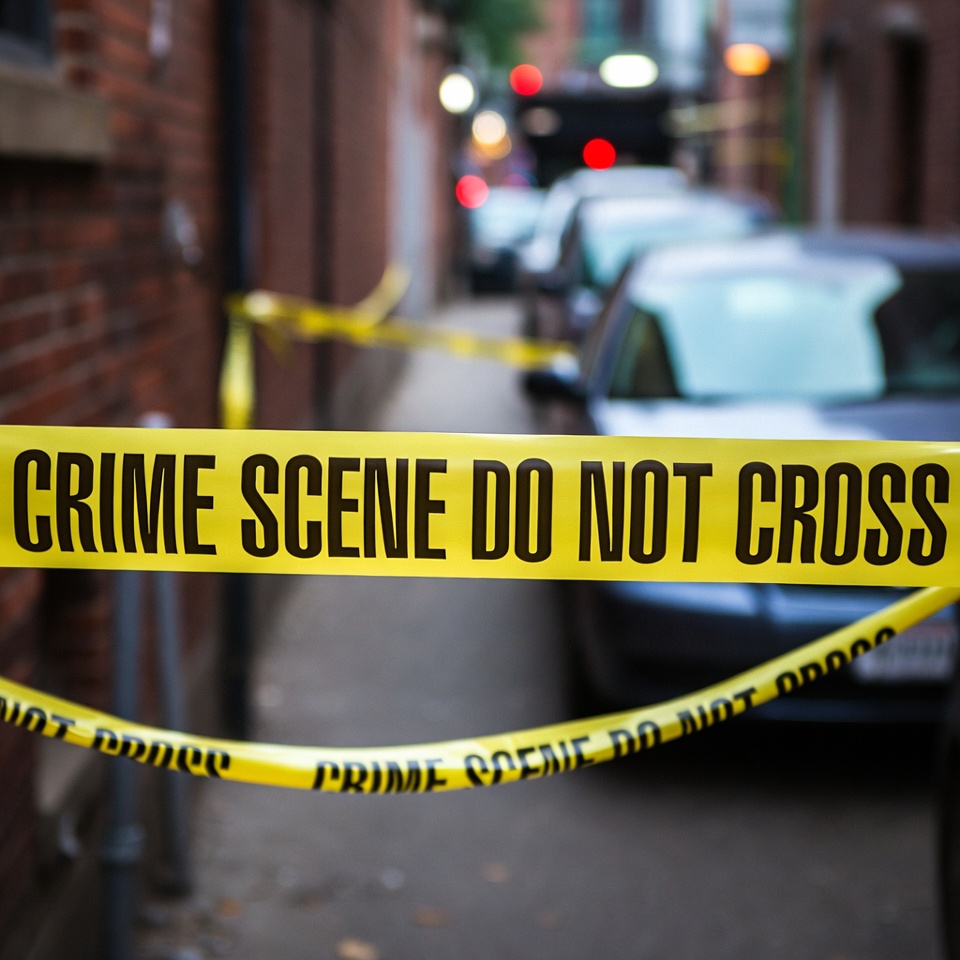 alleyway, blurred lights, brick walls, caution tape, do not cross, emergency lights, investigation site, narrow alley, night scene, parked cars, police tape, street crime, urban street, yellow tape, crime scene