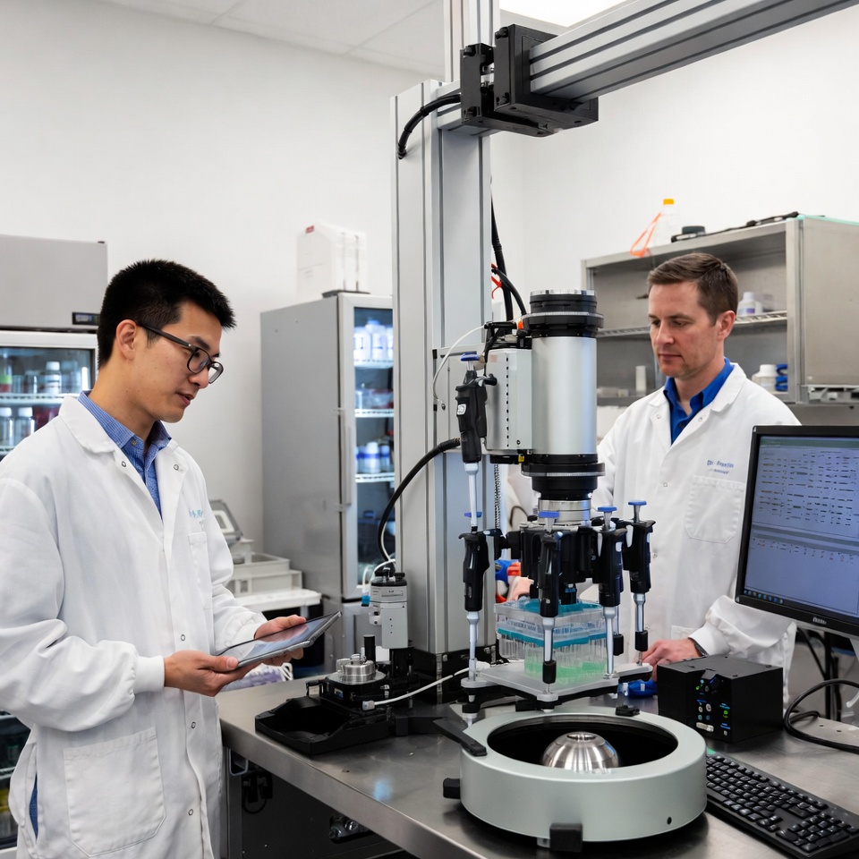 An Asian man with glasses and a white man, both wearing white lab coats, stand at a lab bench examining scientific equipment. The Asian man holds a notepad while they operate a robotic arm with pipettes and test tubes containing green liquid. A computer monitor displays data nearby in the modern laboratory setting.