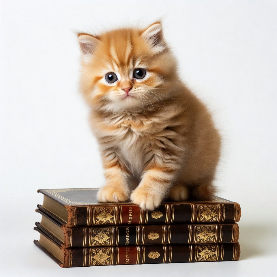adorable kitten, animals, baby cat, big eyes, blue eyes, books, british shorthair, cat, cute kitten, fluffy kitten, isolated background, leather books, old books, orange kitten, pets, reading books, stack of books, white background, kitten