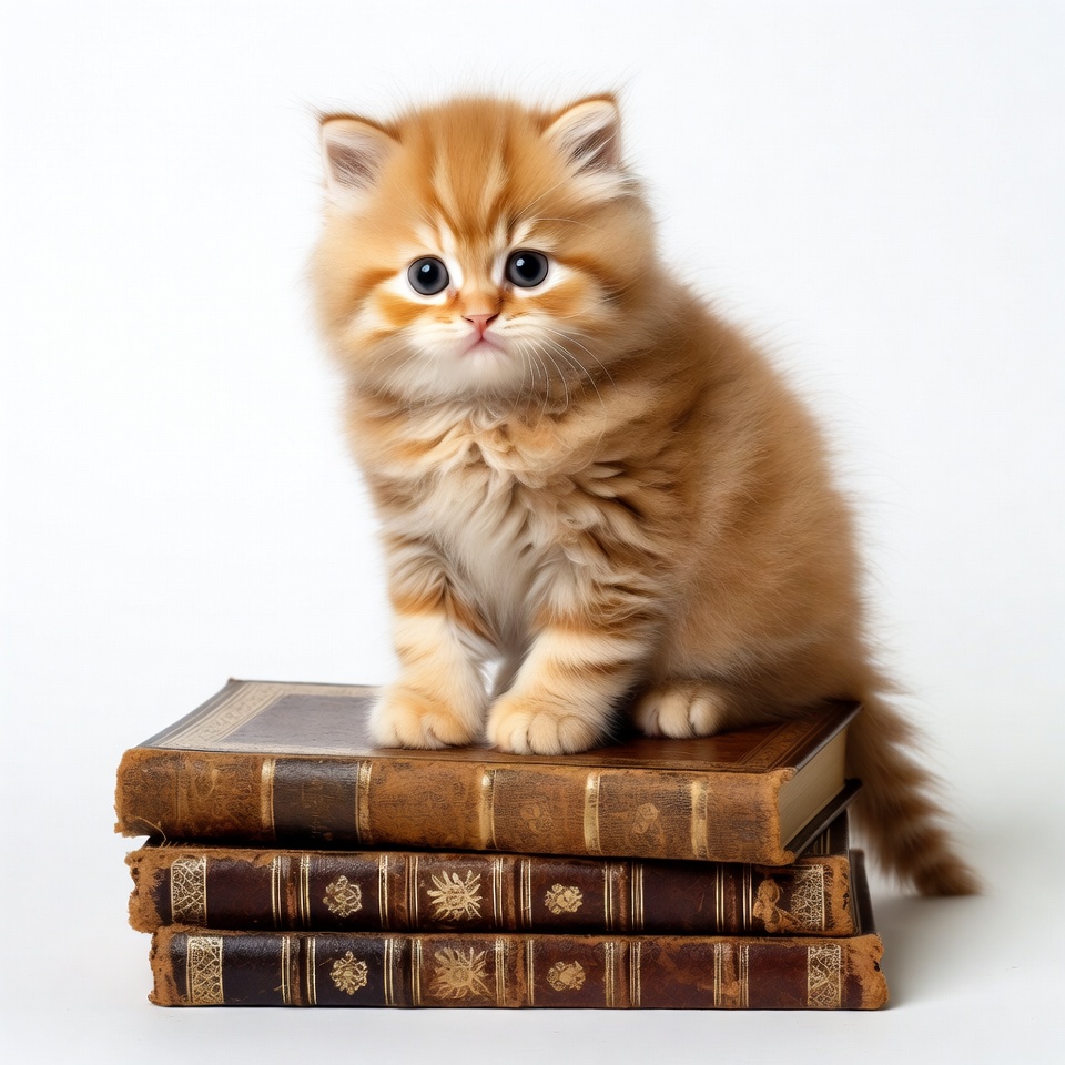 adorable cat, animal, books, british shorthair, cat, cute kitten, fluffy kitten, isolated, leather books, old books, orange kitten, pet, sitting kitten, stack of books, white background, kitten