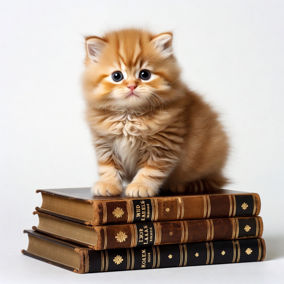 British Shorthair, animal, blue eyes, books, cat, cute kitten, fluffy kitten, isolated background, leather books, old books, orange kitten, sitting cat, stack of books, kitten