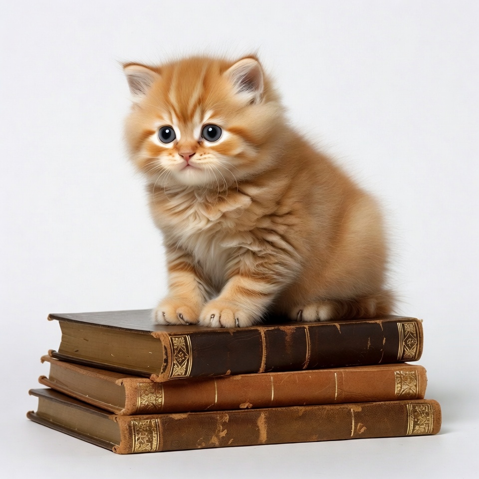British Shorthair, animal, blue eyes, books, brown books, cat, cute kitten, fluffy kitten, isolated background, old books, orange kitten, pet, sitting kitten, stack of books, white background, kitten