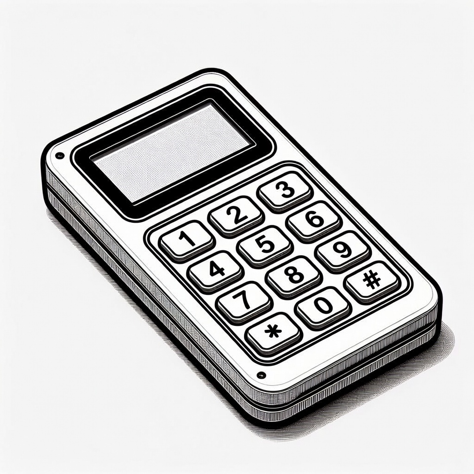 A detailed line art illustration of a white handheld calculator with a blank digital display and numeric keypad. The buttons include numbers 0-9, plus basic operation symbols like +, -, *, /, and #. It is depicted from a three-quarter angle on an isolated white background.