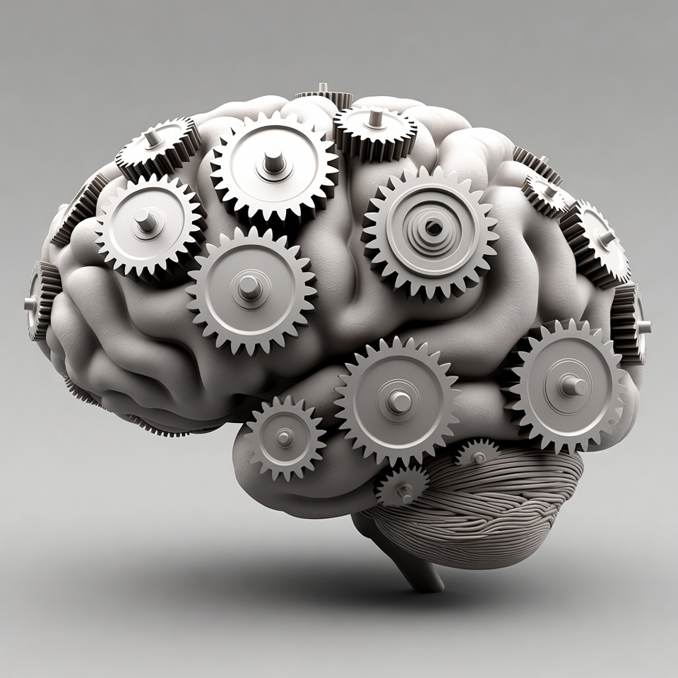 A detailed 3D illustration of a human brain covered in interlocking metallic gears. The brain is rendered in grayscale with intricate mechanical components meshing across its surface. It is isolated against a plain background.