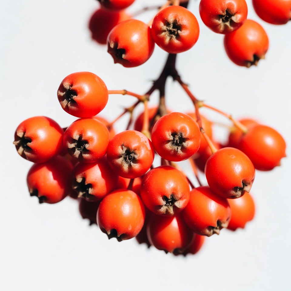 autumn berries, berry cluster, close-up, fresh berries, fruits, mountain ash, nature, organic, plant branches, rowan berries, seeds, tree berries, vibrant red, white background, red berries