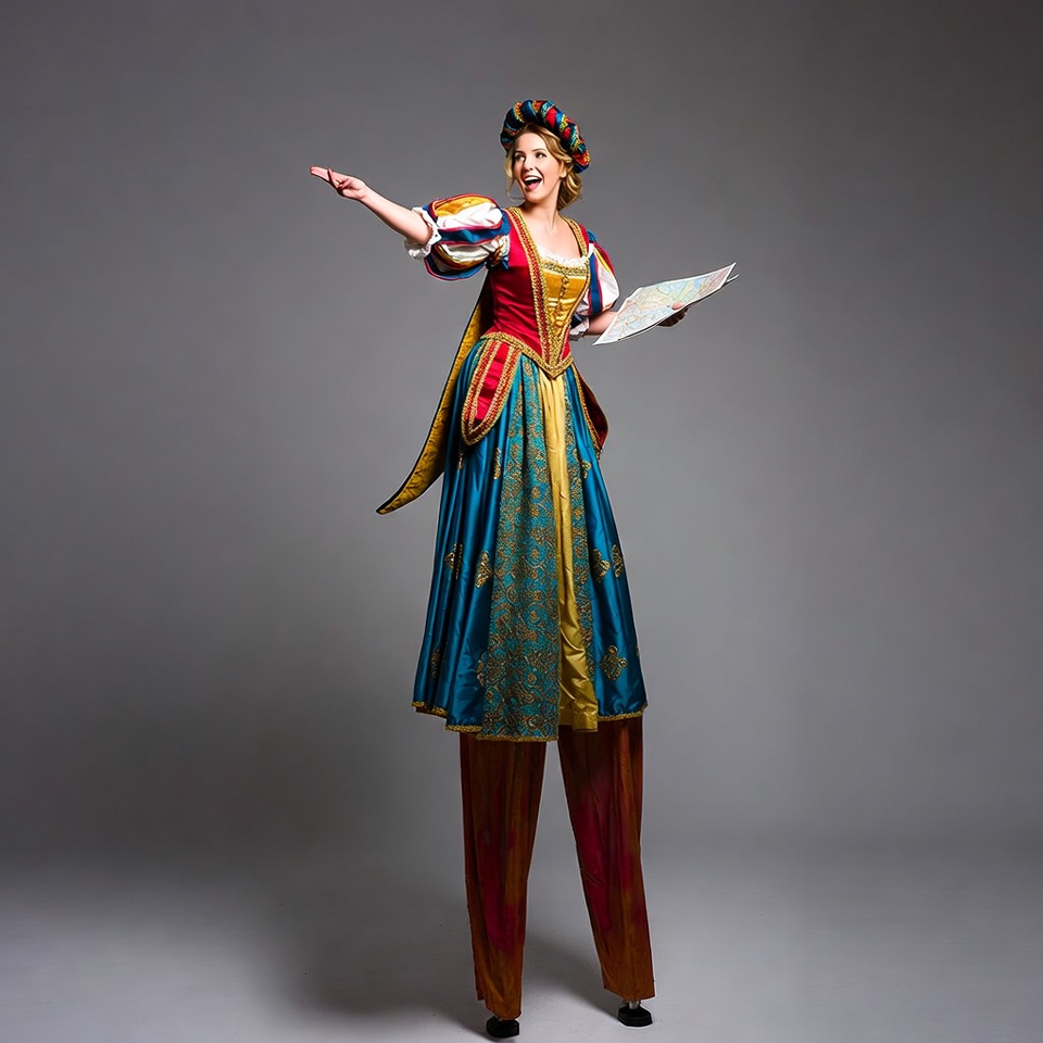 A woman dressed in a vibrant Renaissance costume with multicolored puffed sleeves, gold-trimmed bodice, blue skirt, and red pants stands on a gray background. She wears a multicolored jester hat and holds a map in her right hand while extending her left arm outward. Her blonde hair is styled in an updo, and she appears tall like a stilt-walker.