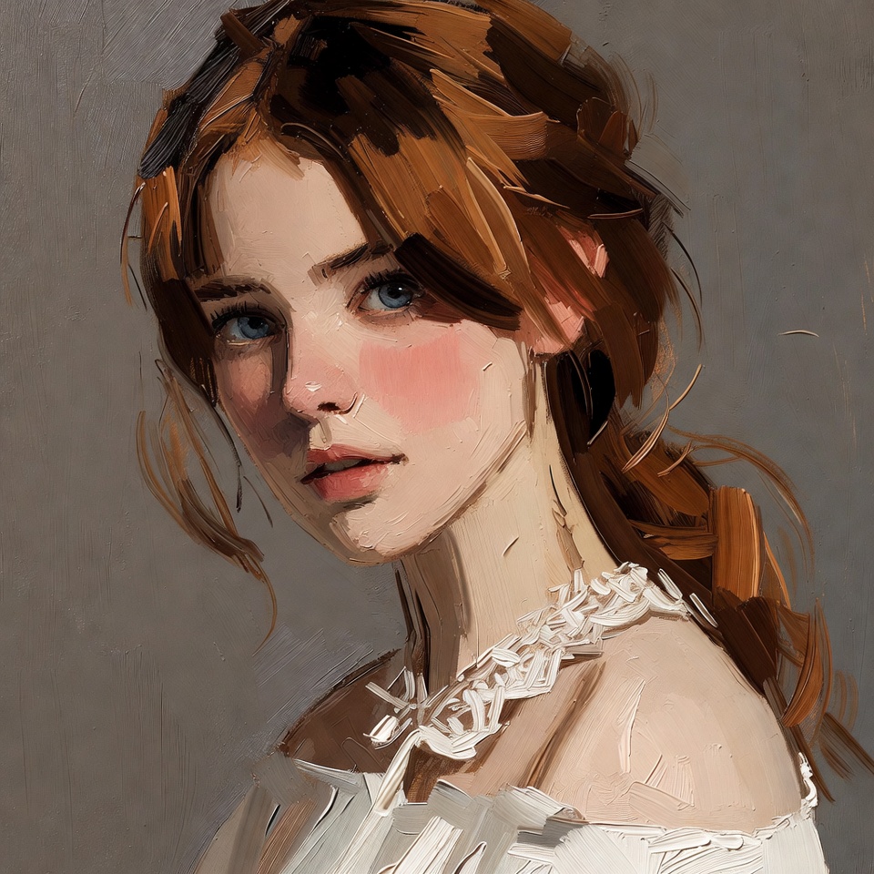 A young woman with long wavy red hair styled in a loose ponytail gazes to the side. She has striking blue eyes, flushed cheeks, and pale skin, wearing a white off-shoulder top with lace trim. The portrait is rendered in a digital painting style against a plain gray background.