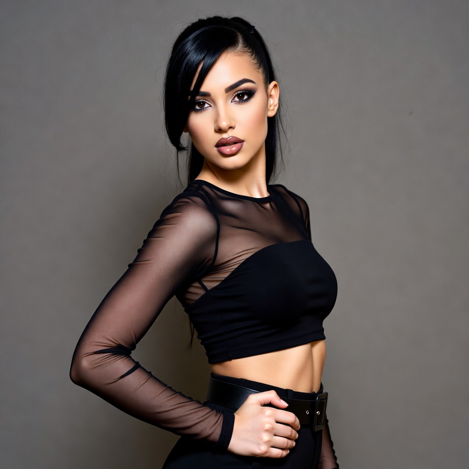 belt, black hair, black outfit, bold makeup, crop top, dark eyeliner, fashion, female, full lips, gray background, high waisted pants, long sleeve, midriff, ponytail, portrait, sheer top, side pose, stylish, young woman, woman