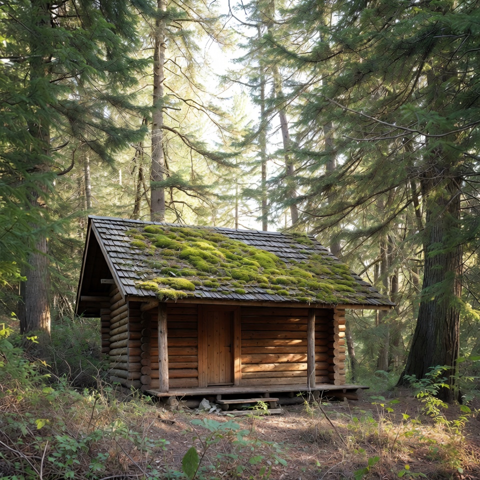 A small wooden log cabin with a moss-covered roof sits in a dense forest of tall evergreen trees. Sunlight filters through the canopy, illuminating the cabin's rustic brown logs and front porch. Surrounding underbrush and trees create an isolated woodland setting.