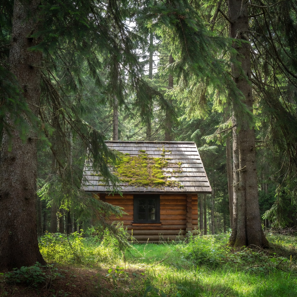 black window, cabin interior, coniferous forest, dense woods, evergreen trees, ferns, fir trees, foliage, forest, forest path, green canopy, green grass, mossy roof, mountain cabin, nature, outdoor, peaceful woods, pine trees, rustic cabin, scenic, spruce trees, sunlight, trees, wilderness, wooden cabin, woodland, log cabin