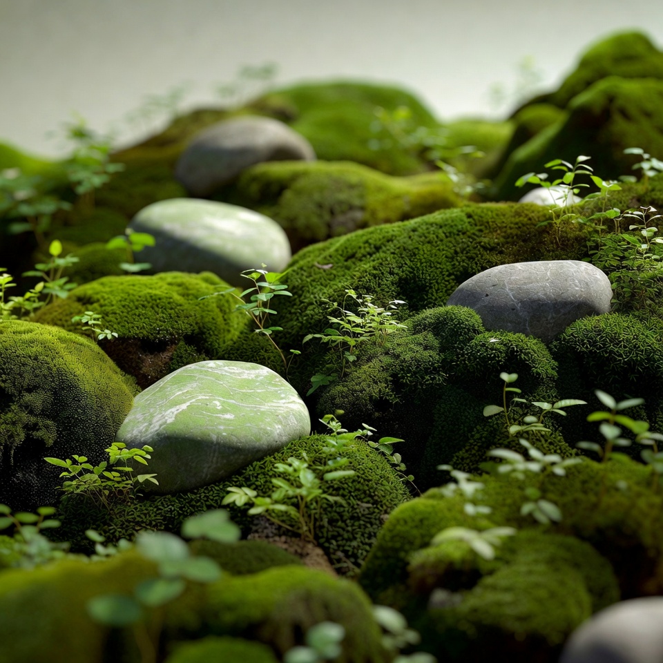 A close-up view shows vibrant green moss growing thickly over gray rocks in a natural cluster. Delicate green sprouts emerge among the mossy surfaces. The scene features a soft, blurred background for depth.