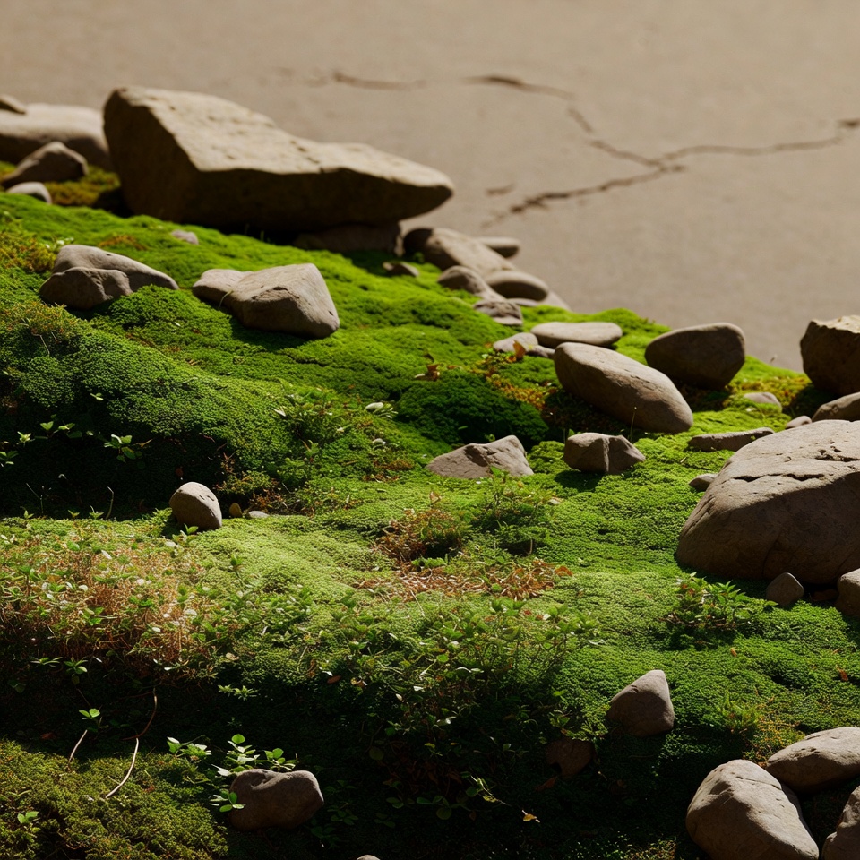 close-up, cracked ground, earthy, gray rocks, green moss, ground cover, moss-covered rocks, nature, outdoor, pebbles, rocks, stones, sunlight, texture, moss