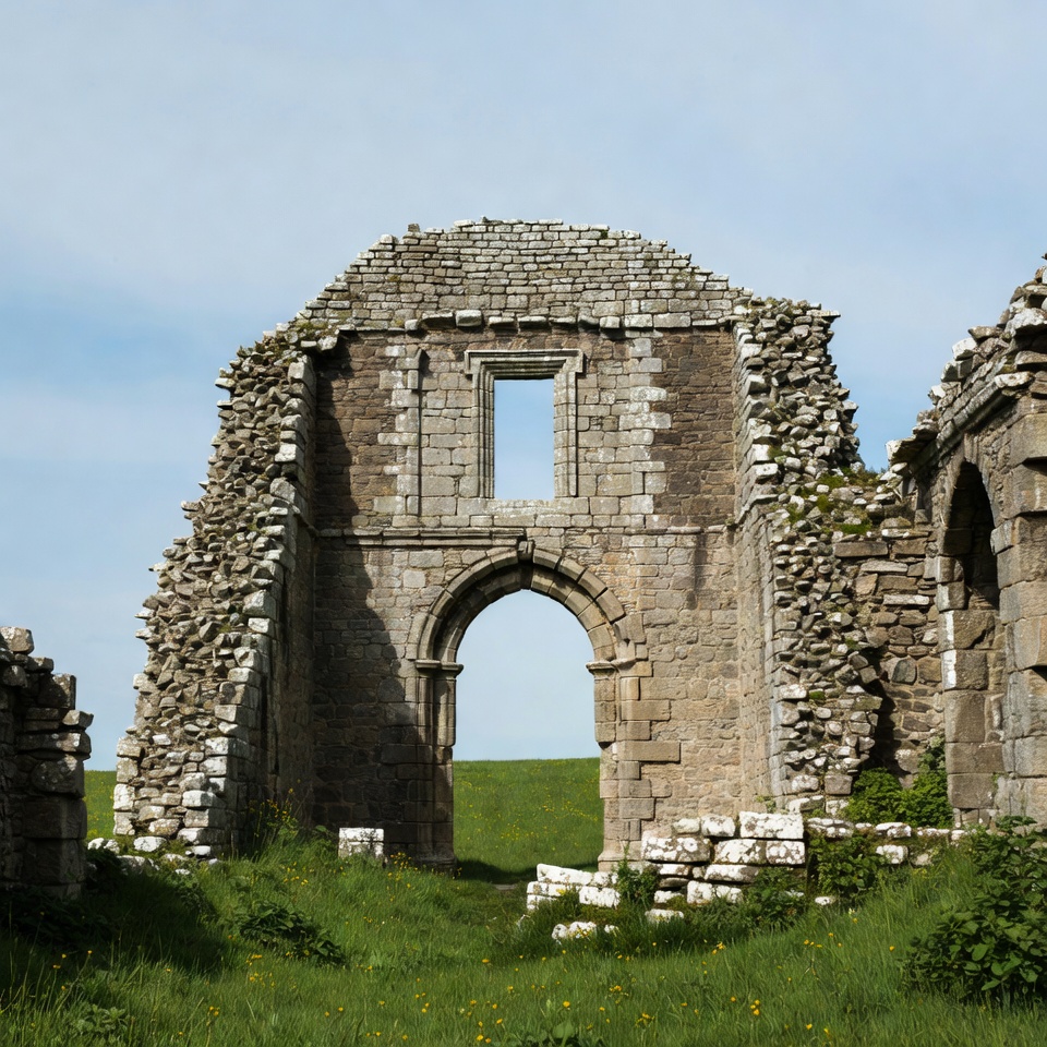 abbey ruins, ancient ruins, arched doorway, arched window, blue sky, castle ruins, countryside, grassland, green grass, heritage site, historic site, ivy, medieval architecture, mossy stones, old architecture, overgrown ruins, rubble, stone arch, stone walls, weathered stone, wildflowers, ruins