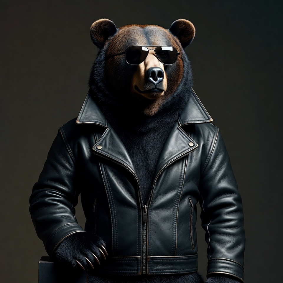 A anthropomorphic brown bear stands confidently wearing dark sunglasses and a black leather jacket with a notched collar. The bear has a serious expression with its paws positioned at its sides against a dark gradient background. Its fur is detailed and textured, giving a realistic yet stylized appearance.