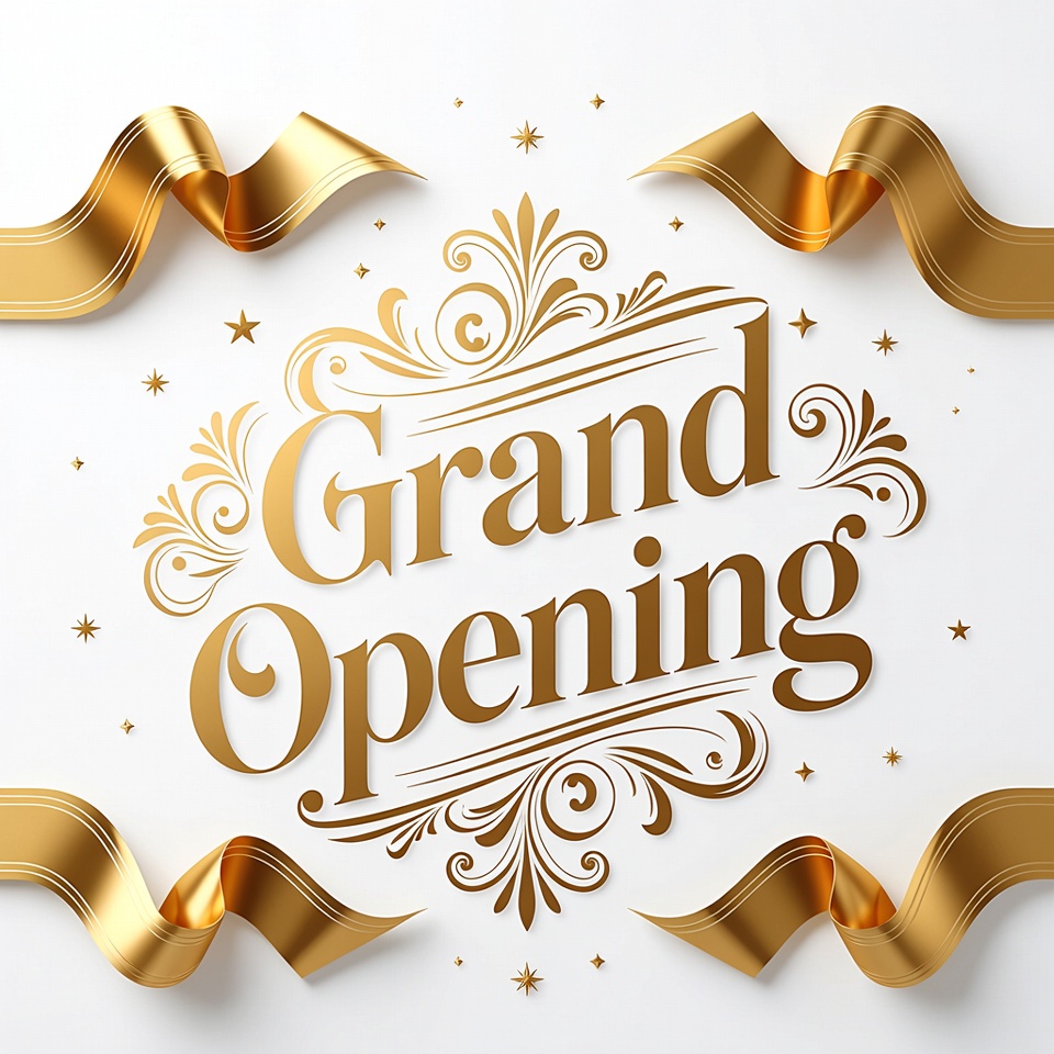Elegant grand opening text in ornate gold lettering centered on a white background. Golden ribbons curl around the text with decorative flourishes and sparkling stars. The design features a symmetrical layout with swirling ribbon ends.