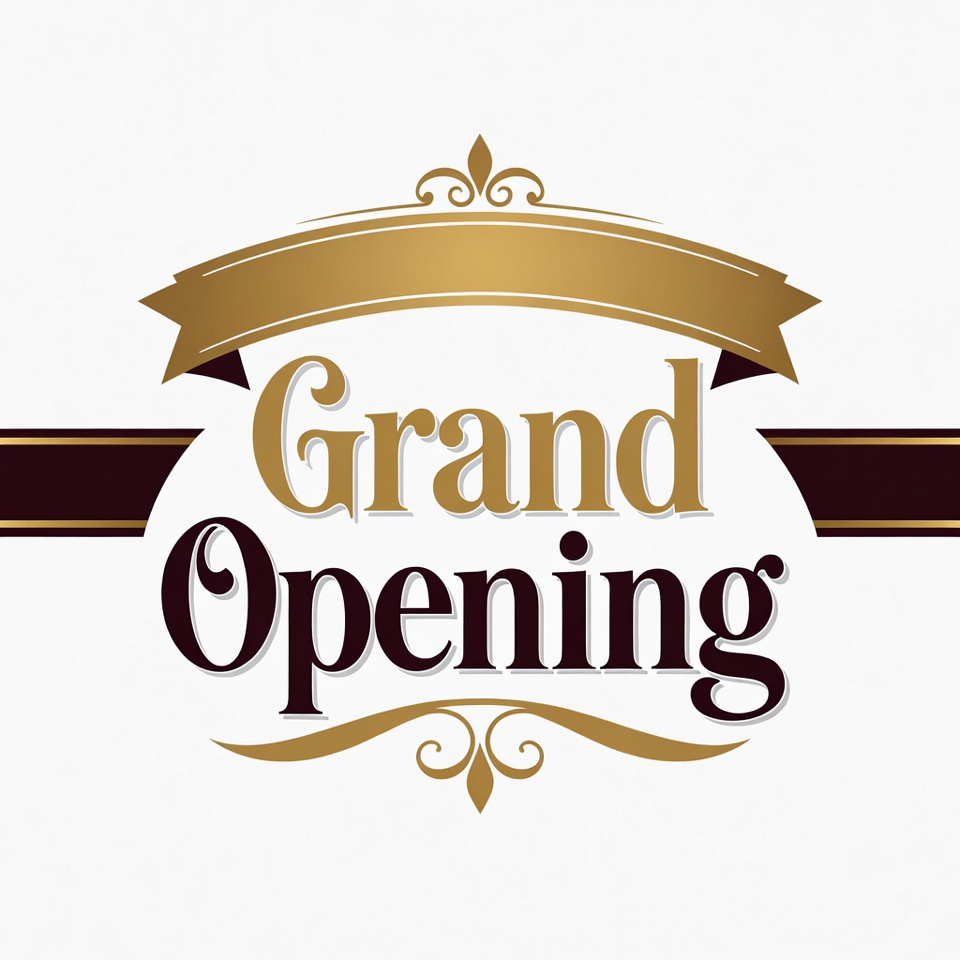 A decorative gold ribbon banner displays 'Grand Opening' in elegant white and dark red text. Ornate gold flourishes and borders frame the text on a white background. The design features a classic, celebratory style suitable for business events.