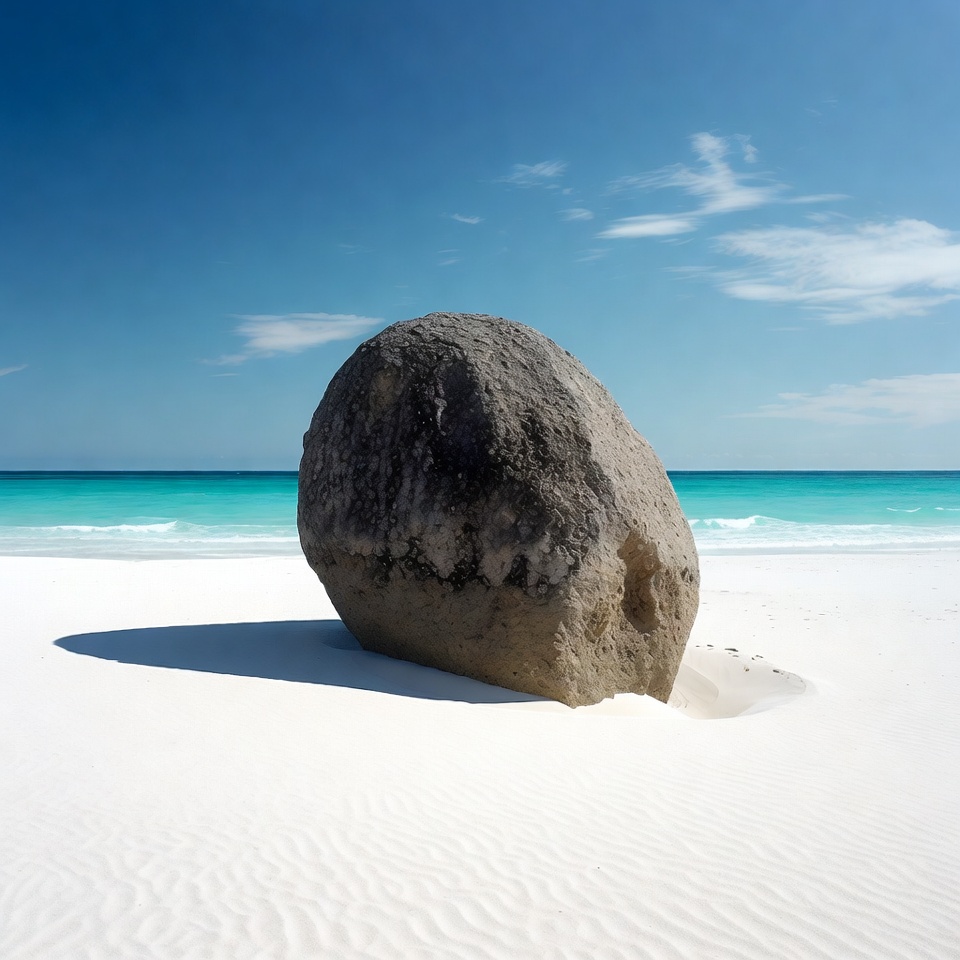 A large, rounded gray boulder sits prominently on a pristine white sand beach. Turquoise ocean waves gently lap at the shore under a clear blue sky with scattered clouds. The boulder casts a distinct shadow onto the fine white sand.