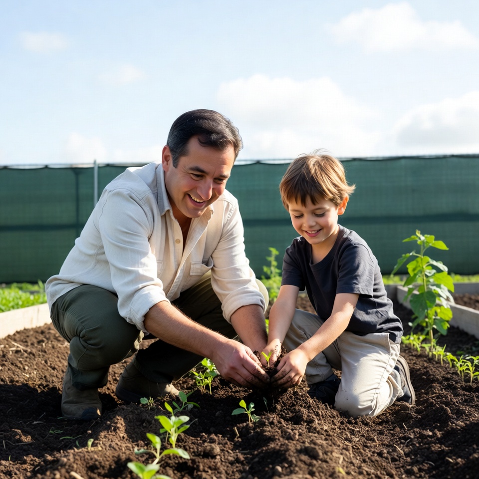 A smiling father and young boy kneel together in a garden bed, planting small green seedlings into the soil. The father wears a white shirt and khaki pants while the boy is dressed in a dark t-shirt and light pants. They are surrounded by young plants and a green fence under a partly cloudy sky.