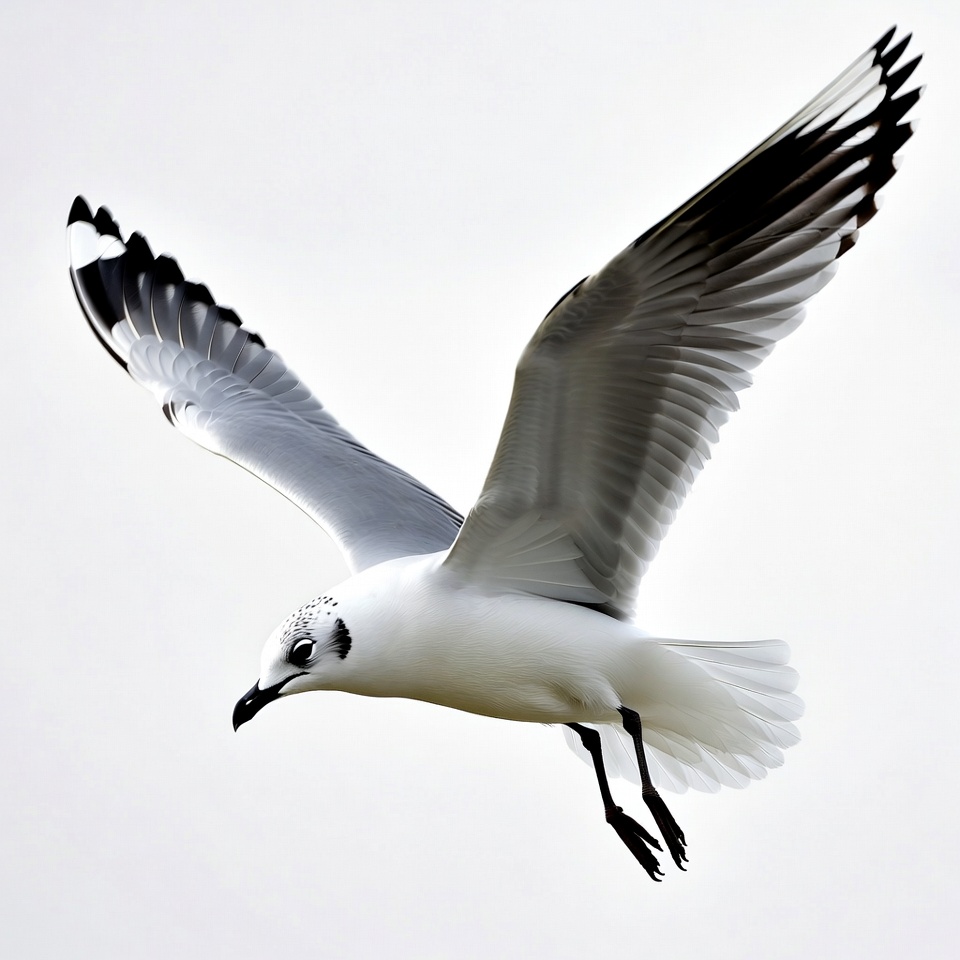 A seagull flies with wings spread wide against a plain white background. Its feathers are gray and white with black wing tips and a yellow beak. The bird is captured mid-flight, legs extended downward.