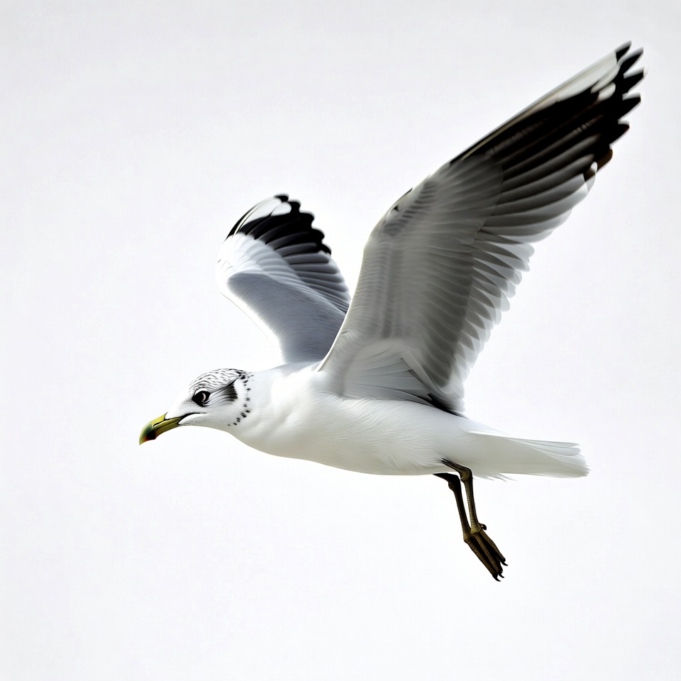 A white seagull with gray wings and black wingtips soars through the air against a plain white background. Its yellow beak and legs are visible, and it has dark markings around its eyes. The bird is captured mid-flight with wings fully extended.
