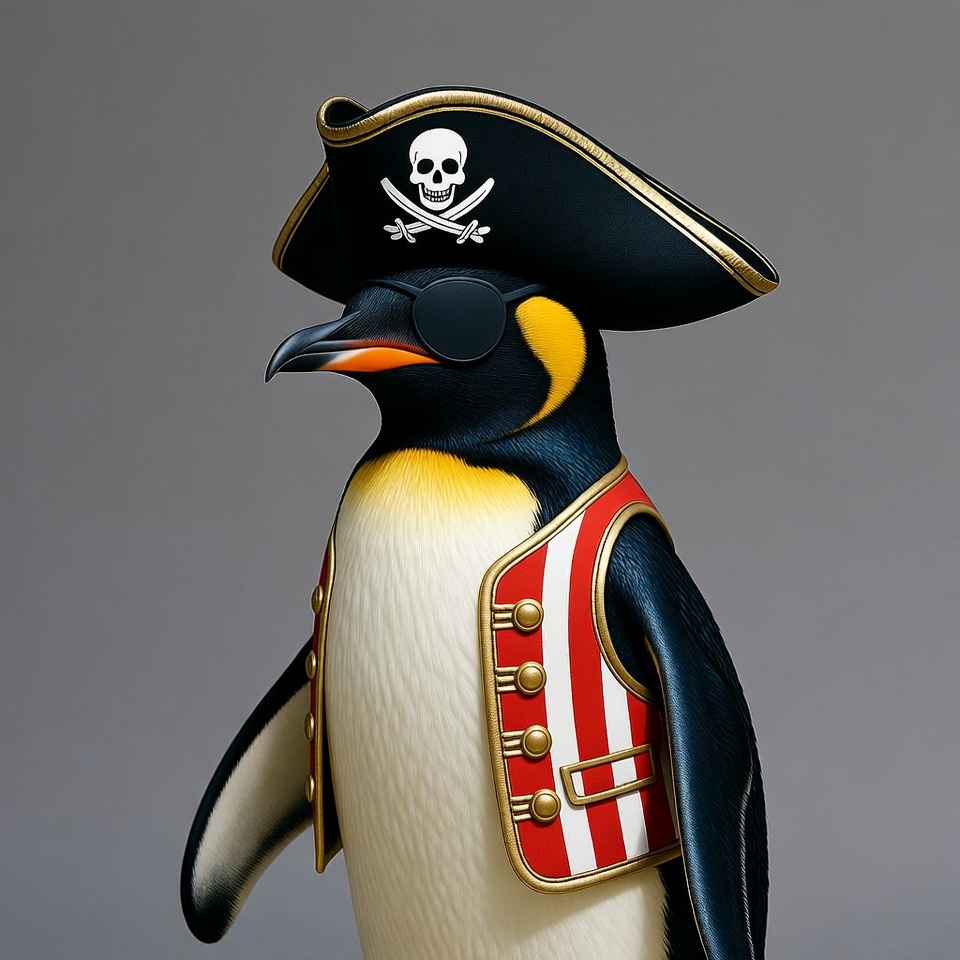 A cartoon emperor penguin stands dressed as a pirate on a gray background. It wears a black tricorn hat with white skull and crossbones emblem and orange sunglasses. The penguin has a red and white striped vest with gold buttons.