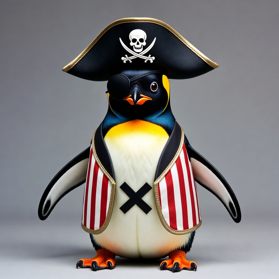 animal costume, bird, black hat, cartoon, clipart, cute animal, eye patch, fun pirate, gray background, illustration, isolated, penguin, pirate, pirate hat, skull crossbones, striped vest, toy penguin, pirate penguin