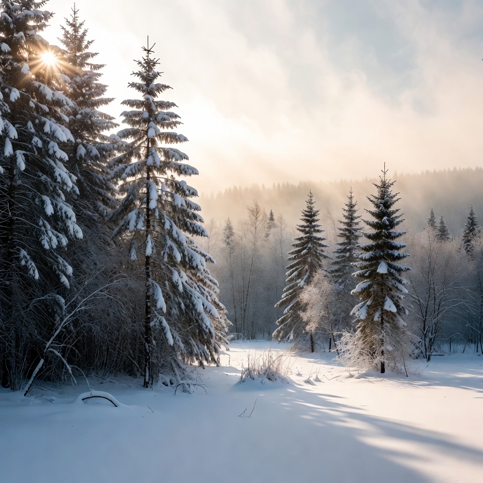 Tall pine trees covered in snow stand in a winter forest under a cloudy sky. Sunlight rays filter through the branches, casting shadows on the snowy ground. Frosty bushes and distant trees enhance the serene winter landscape.