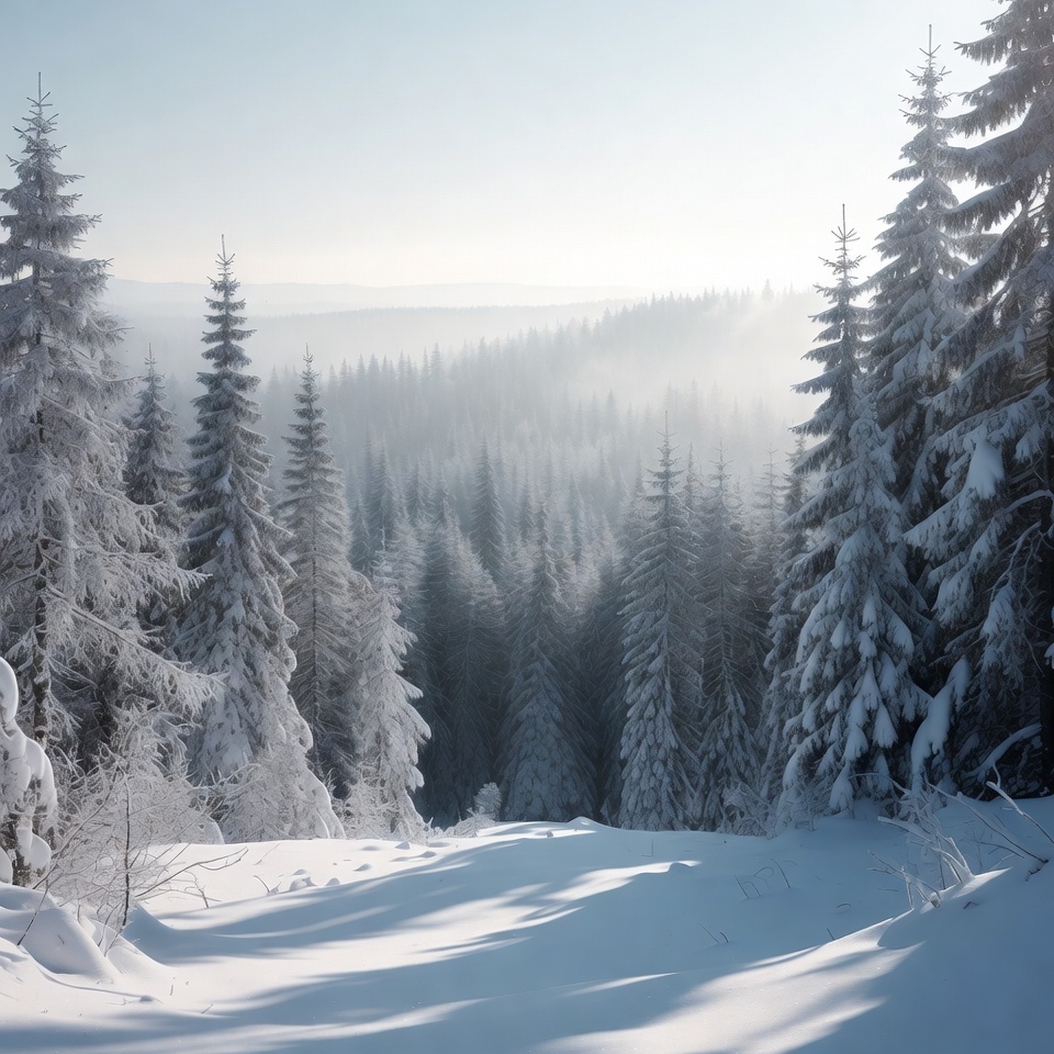 blue sky, cold weather, evergreen trees, fir trees, foggy valley, forest path, misty forest, morning sunlight, mountain forest, nature landscape, pine trees, serene forest, snow covered trees, snow scene, snowy slope, sun rays, white snow, winter landscape, winter scenery, snowy forest