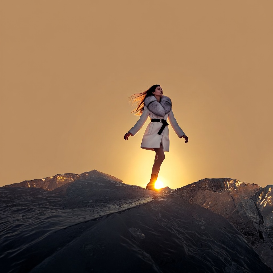 White, adventure, arms outstretched, belt, blowing hair, boots, cold weather, dramatic lighting, dynamic pose, fashion model pose, female, fur coat, golden hour, long hair, luxury coat, mountain ridge, nature background, outdoor scene, peak summit, snow peaks, snowy mountains, stylish coat, sunset, white coat, winter fashion, woman