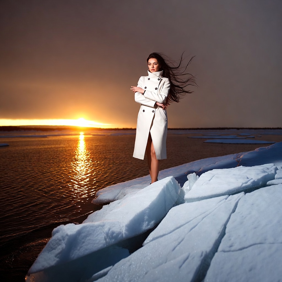 A woman with long dark hair stands on ice floes by a frozen lake at sunset. She wears a long white coat with her arms crossed and hair blowing in the wind. The golden sun reflects on the water amid surrounding ice chunks.